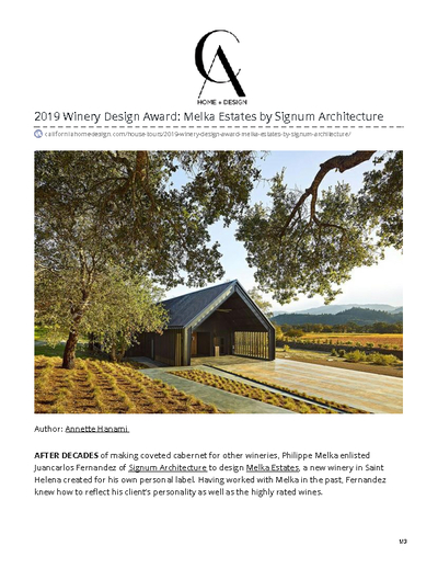 AFTER DECADES of making coveted cabernet for other wineries, Philippe Melka enlisted Juancarlos Fernandez of Signum Architecture to design Melka Estates, a new winery in Saint Helena created for his own personal label. Having worked with Melka in the past, Fernandez knew how to reflect his client’s personality as well as the highly rated wines.